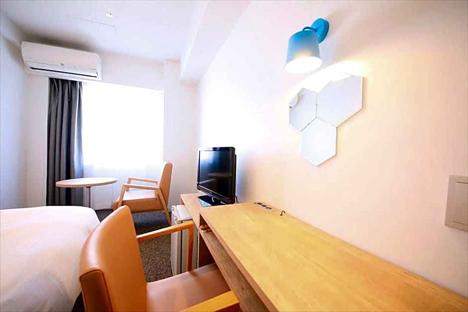Basic room featuring a flat-screen TV, a fridge and a desk. A hairdryer and free toiletries are provided in the attached bathroom.